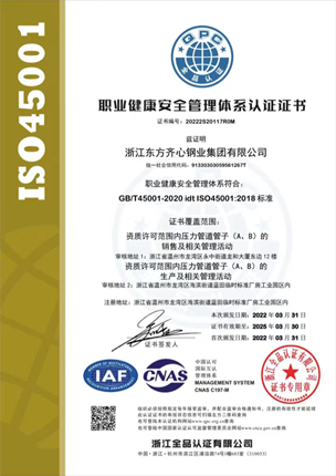 公司始終堅持生產(chǎn)高性能不銹鋼管的產(chǎn)品定位,持續(xù)改進品質(zhì)。先后取得了不銹鋼管特種設備(壓力管道元件)認證等多張生產(chǎn)許可證,并通過ISO9001:2015質(zhì)量管理體系、ISO14000:2004環(huán)境管理體系認證、GB/T28001-2011職業(yè)健康安全管理體系認證。